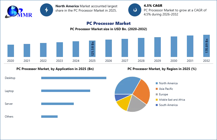 The PC Processor Market size was valued at USD 125.58 Billion in 2025 and the total PC Processor revenue is expected to grow at a CAGR of 4.5% from 2026 to 2032, reaching nearly USD 170.90 Billion.
