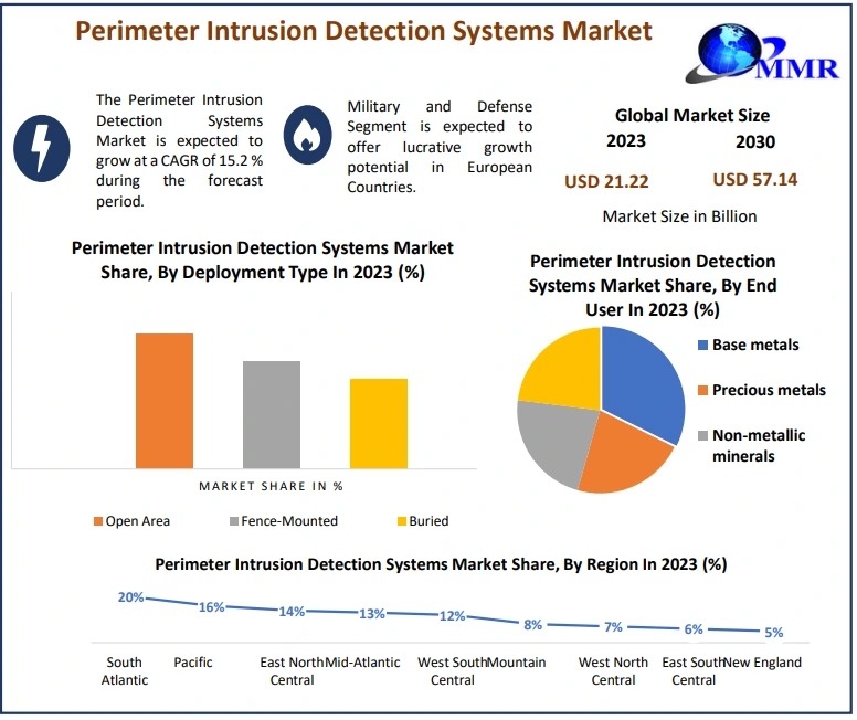 Global Perimeter Intrusion Detection Systems Market Report Coverage Details Base Year: 2023 Forecast Period: 2024-2030 Historical Data: 2018 to 2023 Market Size in 2023: US $ 21.22 Bn. Forecast Period 2024 to 2030 CAGR: 15.2% Market Size in 2030: US $ 57.14 Bn. Segments Covered: by Component Hardware Software Services by Deployment Type Open Area Fence-Mounted Buried by End User Critical Infrastructure Military and Defense Government Transportation Others Perimeter Intrusion Detection Systems Market, by Region: