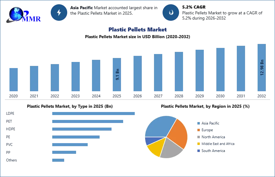 Plastic Pellets Market was valued at USD 9.1 Bn. in 2025 and is expected to reach USD 12.98 Bn. by 2032, at a CAGR of 5.20% during the forecast period.