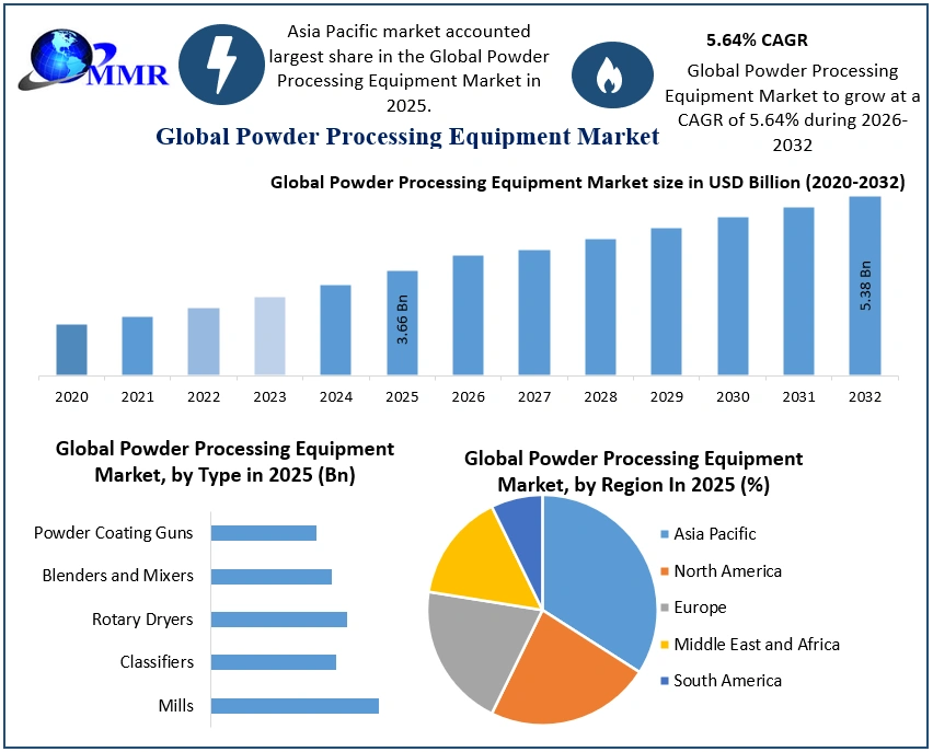 The Powder Processing Equipment Market size was valued at USD 3.66 Billion in 2025 and the total Powder Processing Equipment revenue is expected to grow at a CAGR of 5.64% from 2025 to 2032, reaching nearly USD 5.38 Billion by 2032. The global Powder Processing Equipment market report is a comprehensive analysis of the industry, market, and key players. The report has covered the market by demand and supply-side by segments. The global Powder Processing Equipment report also provides trends by market segments, technology, and investment with a competitive landscape.To Know About The Research Methodology :- Request Free Sample Report