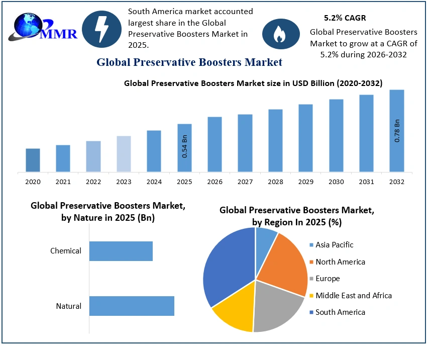 Preservative Boosters Market Report Coverage Details Base Year: 2025 Forecast Period: 2026-2032 Historical Data: 2020 to 2025 Market Size in 2025: USD 0.54 Bn. Forecast Period 2026 to 2032 CAGR: 5.2% Market Size in 2032: USD 0.78 Bn. Segments Covered: by Nature Natural Chemical by End User Cosmetics Industry Chemical Industry Packaging Industry Others by Product Type Velsan Flex Velsan CGE Velsan EHG Velsan SC Others Global Preservative Boosters Market, by Region