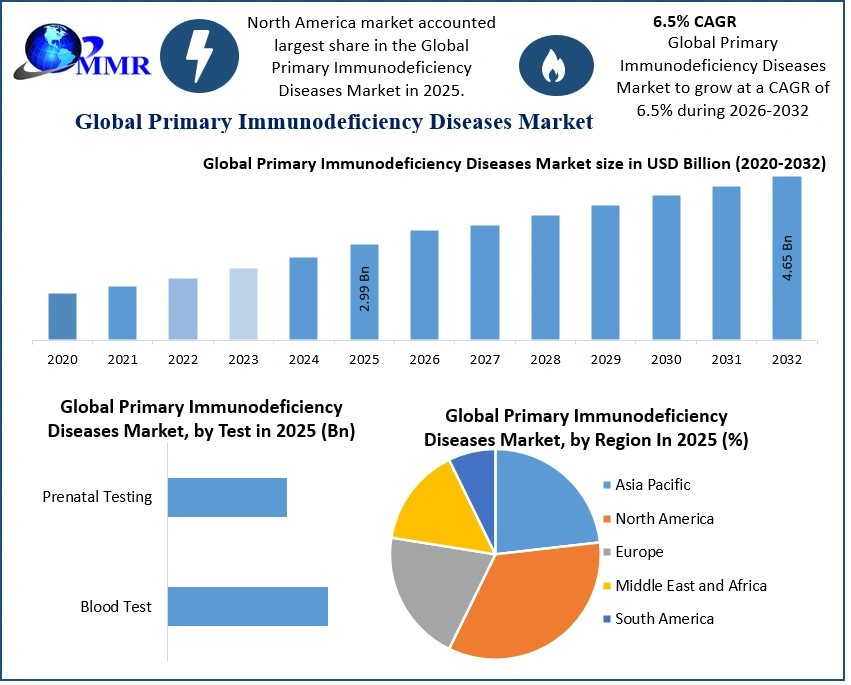 Global Primary Immunodeficiency Diseases Market Report Coverage Details Base Year: 2025 Forecast Period: 2026-2032 Historical Data: 2020 to 2025 Market Size in 2025: USD 2.99 Bn. Forecast Period 2026 to 2032 CAGR: 6.5% Market Size in 2032: USD 4.65 Bn. Segments Covered: by Disease Antibody Deficiency Cellular Immunodeficiency Innate Immune Disorder by Test Blood Test Prenatal Testing by Treatment Immunoglobulin Replacement Therapy Antibiotic Therapy Stem cell and Gene Therapy Others Primary Immunodeficiency Diseases Market, by region
