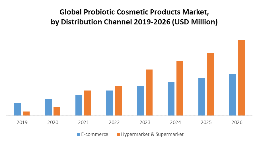 By Product, the probiotic cosmetic products market is segmented into skin, hair care. The skincare segment is accounted for the largest market share of around 90% in terms of revenue in 2022. Probiotics are utilized as a relief ingredient against skin problems, like acne, blemishes, wrinkles, etc. Rising preference towards clinically tested products and the efficacy of probiotics cosmetics adds to the segment growth. Additionally, increasing demand for products that have no side effects is expected to propel product demand in the segment. Manufacturers are expanding their product portfolio and bringing probiotics to the main counter shelves. For example, in November 2019, a new startup focusing on skin microbiome launched its first beauty and cosmetics range, Supermello Hydrating Gel-Cream Moisturizer, Pimple Potion Retinal + Salicylic Acne Treatment, Naked Papaya Gentle Enzyme Face Cleanser, and the turmeric-spiked Self Reflect Probiotic Moisturizing Sunscreen.By Distribution Channel, the market is segmented into hypermarket & supermarket, E-commerce. The hypermarket & supermarket segment led the market and accounted for around 39% in terms of revenue in 2022 thanks to the presence of big retailers, like Sephora and Ulta Beauty.