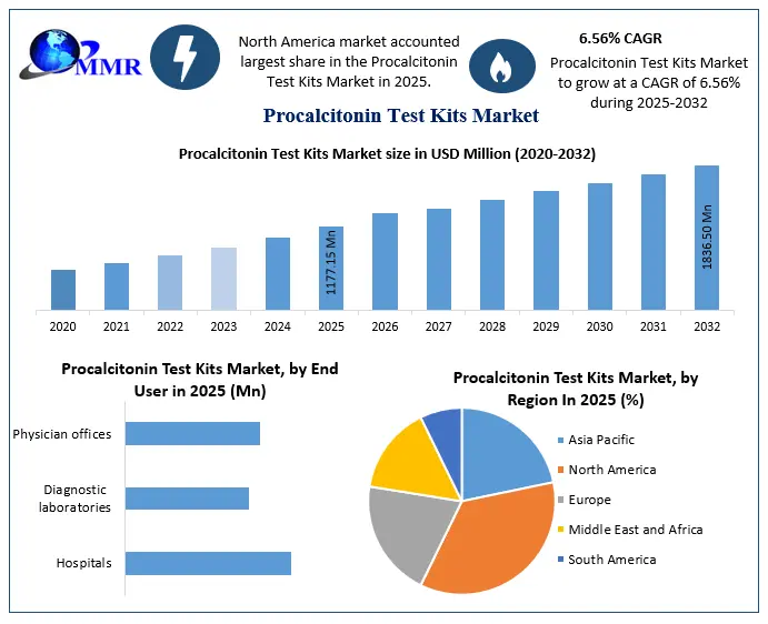 Global Procalcitonin Test Kits Market Report Coverage Details Base Year: 2025 Forecast Period: 2026-2032 Historical Data: 2020 to 2025 Market Size in 2025: US $ 1177.15 Mn. Forecast Period 2026 to 2032 CAGR: 6.56% Market Size in 2032: US $ 1836.50 Mn. Segments Covered: by Product Type Immunoassay test kits Immunochromatography test kits Others by End User Hospitals Diagnostic laboratories Physician offices Others Procalcitonin Test Kits Market, by Region