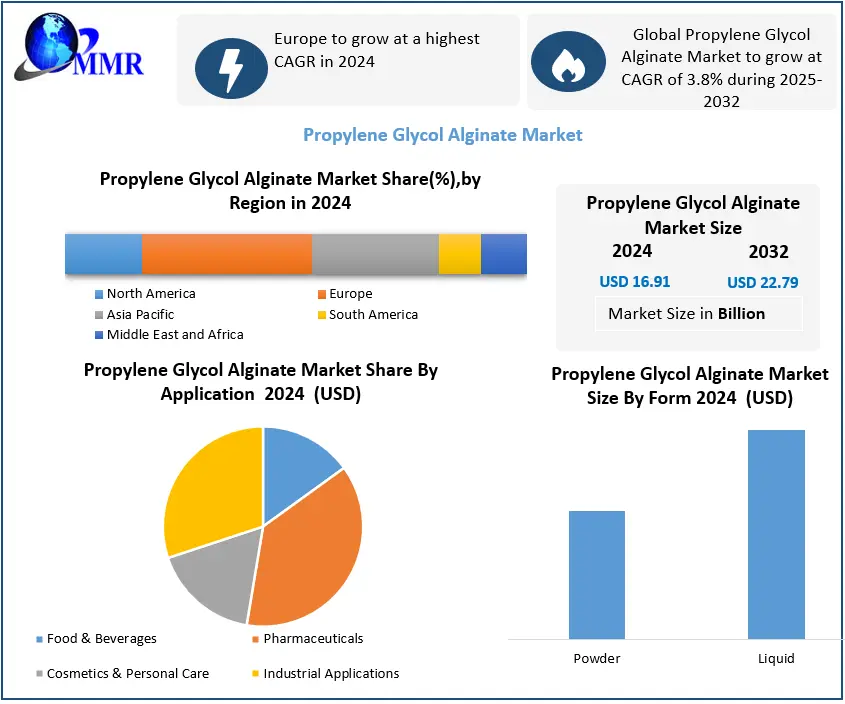 Propylene Glycol Alginate Market was valued at USD 16.91 Bn. in 2024 and the total Global Propylene Glycol Alginate Market revenue is Expected to grow at a CAGR of 3.8% from 2025 to 2032 reaching nearly USD 22.79 Bn. by 2032.Propylene Glycol Alginate Market Overview: