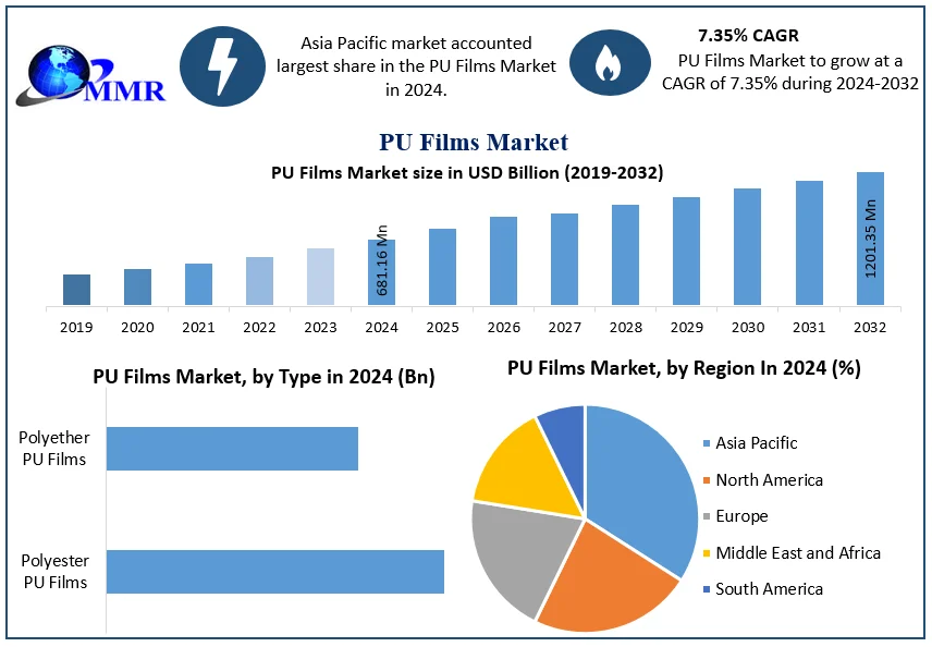 Global PU Films Market Report Coverage Details Base Year: 2024 Forecast Period: 2025-2032 Historical Data: 2019 to 2024 Market Size in 2024: USD 681.16 Million. Forecast Period 2025 to 2032 CAGR: 7.35% Market Size in 2032: USD 1201.35 Million. Segments Covered: by Type Polyester PU Films Polyether PU Films by Function Thermoplastic-Based PU Films Thermoset-Based PU Films by End-Use Industry Textile & Leisure Automotive & Aerospace Medical Others PU Films Market, by Region