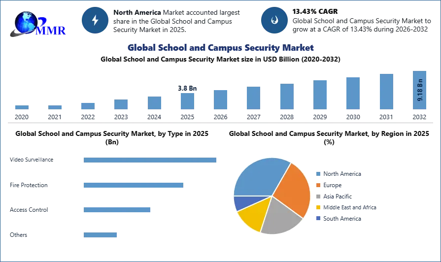 School and Campus Security Market size was valued at USD 3.8 Bn. in 2025 and the total revenue is expected to grow at a CAGR of 13.43 % through 2026 to 2032, reaching nearly USD 9.18 Bn.