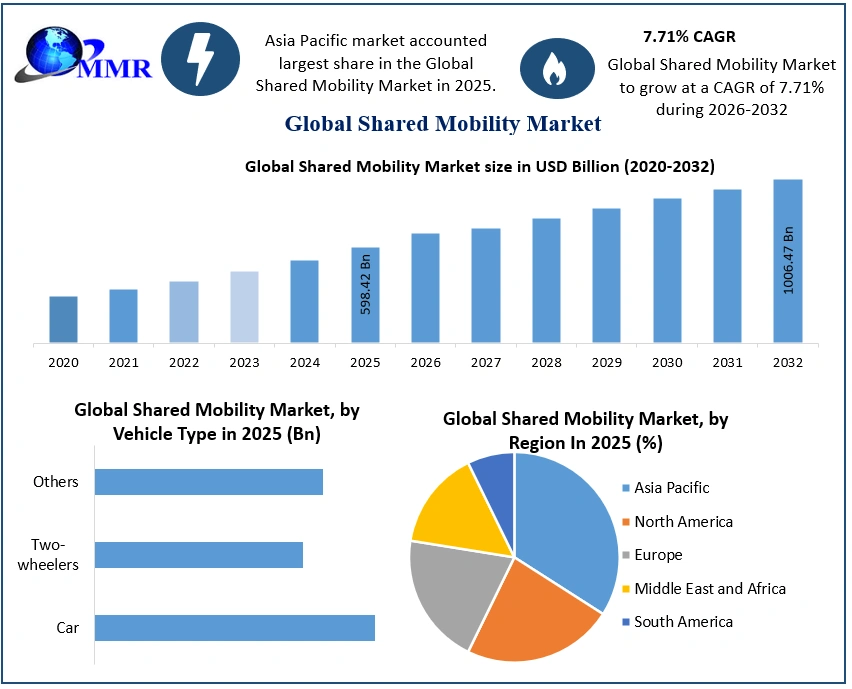 The Shared Mobility Market size was valued at USD 598.42 Billion in 2025 and the total Shared Mobility revenue is expected to grow at a CAGR of 7.71% from 2026 to 2032, reaching nearly USD 1006.47 Billion by 2032.
