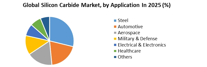 By Application: Market segmentation in the silicon carbide (SiC) market is done by application, which includes important sectors such as Power Electronics, Steel, Automotive, Aerospace, and Defense. The segment of power electronics is one of the most broadly utilized applications. Power devices made from SiC are becoming very popular because they offer better effectiveness, improved thermal control, and higher power density compared to old-fashioned semiconductor materials that use only silicon. The use of power electronics based on SiC is widespread in electric vehicles (EVs), renewable energy systems, industrial power supplies, and grid applications.