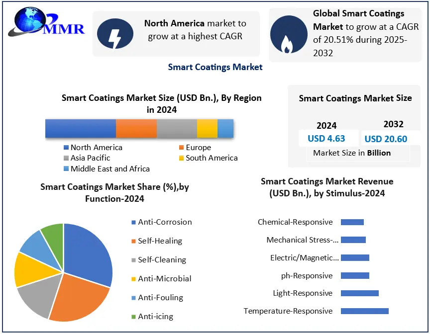 Global Smart Coatings Market Report Coverage Details Base Year: 2024 Forecast Period: 2025-2032 Historical Data: 2019 to 2024 Market Size in 2024: USD 4.63 Bn. Forecast Period 2025 to 2032 CAGR: 20.51% Market Size in 2032: USD 20.60 Bn. Segments Covered: by Function Anti-corrosion Anti-fouling Anti-icing Anti-microbial Self-healing Self-cleaning by Stimulus Temperature-Responsive Light-Responsive pH-Responsive Electric/Magnetic Field-Responsive Mechanical Stress-Responsive Chemical-Responsive by Layer Single layer Multi-layer by End-Use Industry Automotive & Transportation Aerospace & Defence Marine Building & Construction Smart Coatings Market, by Region
