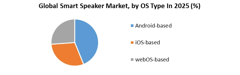 Also, Android’s open-source nature allows manufacturers like JBL, Xiaomi, Lenovo, and Sony to develop cost-effective smart speakers for diverse price segments, increasing market penetration. While iOS-based smart speakers, such as Apple HomePod, cater to premium users, their adoption is limited to Apple device owners. WebOS-based devices remain niche, keeping Android-based smart speakers as the dominant segment driving global market growth.
