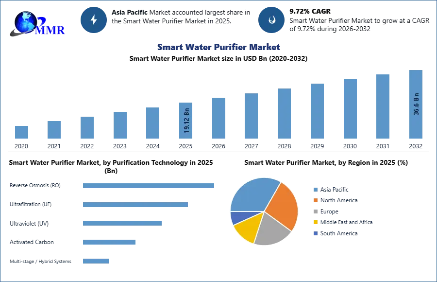 Smart Water Purifier Market was valued at USD 19.12 billion in 2025, and total global Smart Water Purifier Market revenue is expected to grow at a CAGR of 9.72% from 2026 to 2032, reaching nearly USD 36.6 billion. Rising concerns over waterborne diseases.