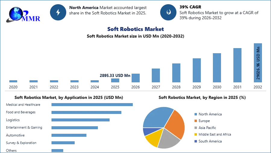Global Soft Robotics Market size was valued at USD 2895.33 Mn. in 2025 and the total revenue is expected to grow at 39.00 % through 2026 to 2032, reaching nearly US$ 29026.96 Mn.