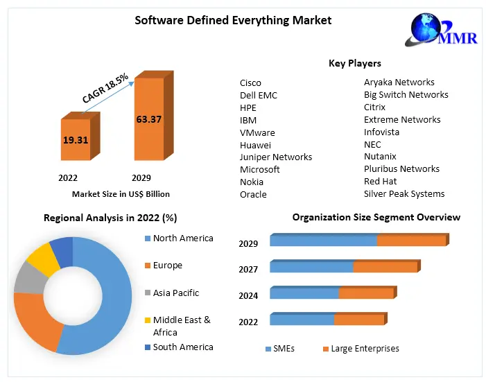 1. Cisco 2. Dell EMC 3. HPE 4. IBM 5. VMware 6. Huawei 7. Juniper Networks 8. Microsoft 9. Nokia 10.Oracle 11.Aryaka Networks 12.Big Switch Networks 13.Citrix 14.Extreme Networks 15.Infovista 16.NEC 17.Nutanix 18.Pluribus Networks 19.Red Hat 20.Silver Peak Systems 21.SUSE 22.Adaptiv Networks Frequently Asked Questions: 1. Which region has the largest share in Global Software Defined Everything Market? Ans: North America region held the highest share in 2022. 2. What is the growth rate of Global Software Defined Everything Market? Ans: The Global Software Defined Everything Market is expected to grow at a CAGR of 18.50% during forecast period 2023-2029. 3. What is scope of the Global Software Defined Everything Market report? Ans: Global Software Defined Everything Market report helps with the PESTEL, PORTER, COVID-19 Impact analysis, Recommendations for Investors & Leaders, and market estimation of the forecast period. 4. Who are the key players in Global Software Defined Everything Market? Ans: The important key players in the Global Software Defined Everything Market are - Cisco, Dell EMC, HPE, IBM, VMware, Huawei, Juniper Networks, Microsoft, Nokia, Oracle, Aryaka Networks, Big Switch Networks, Citrix, Extreme Networks, Infovista, NEC, Nutanix, Pluribus Networks, Red Hat, Silver Peak Systems, SUSE, and Adaptiv Networks. 5. What is the study period of this market? Ans: The Global Software Defined Everything Market is studied from 2022 to 2029.