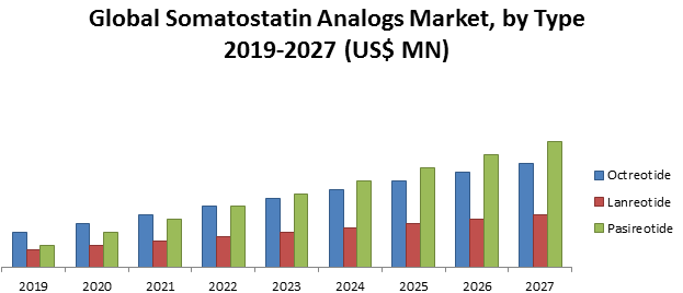 An increase in the R&D activities in the Somatostatin analogs market is having a positive impact on market growth. A number of studies are being conducted for further research and advancement in the already existing drug molecules. The number of patients diagnosed with Neuroendocrine Tumors (NETs) is increasing each year. This creates a demand to develop improved treatments ultimately resulting in the market growth. World Alliance of Pituitary Organizations (WAPO) has launched a global awareness campaign to increase awareness about Acromegaly and the role of Somatostatin analogs in its treatment. The participation of some major market players gives a further boost to the market.Somatostatin Analogs Market Segmentation: