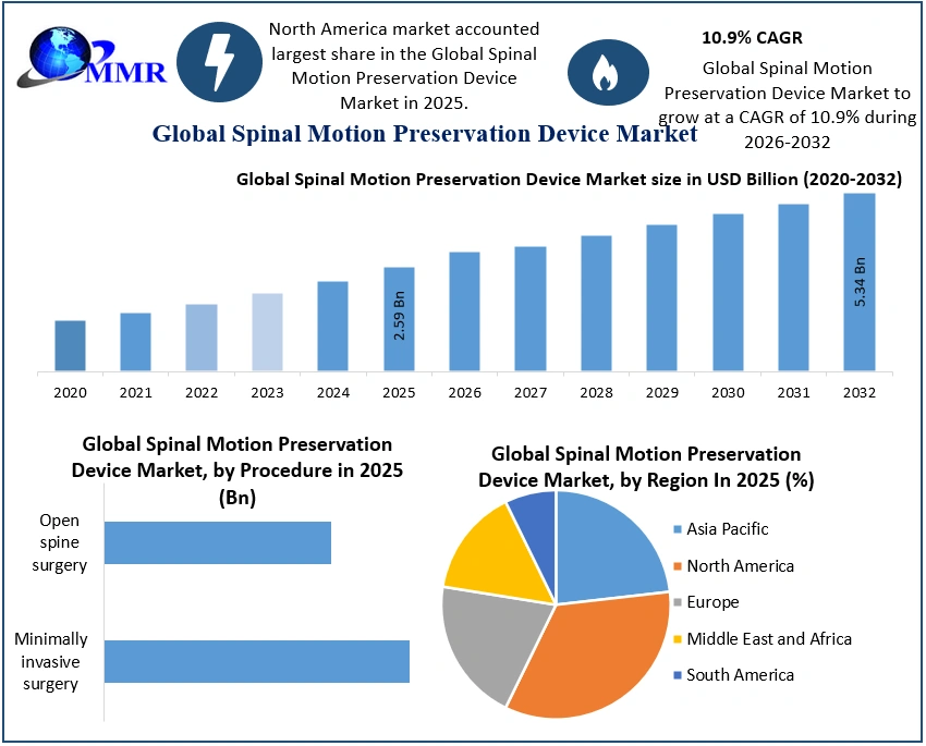 Global Spinal Motion Preservation Device Market Report Coverage Details Base Year: 2025 Forecast Period: 2026-2032 Historical Data: 2020 to 2025 Market Size in 2025: USD 2.59 Bn. Forecast Period 2026 to 2032 CAGR: 10.9% Market Size in 2032: USD 5.34 Bn. Segments Covered: by Device Type Nuclear disc prostheses devices Annulus repair devices Artificial discs Dynamic stabilization devices by Procedure Minimally invasive surgery Open spine surgery by End User Orthopaedic surgical centres Ambulatory care centres Hospitals and clinics Spinal Motion Preservation Device Market, by Region