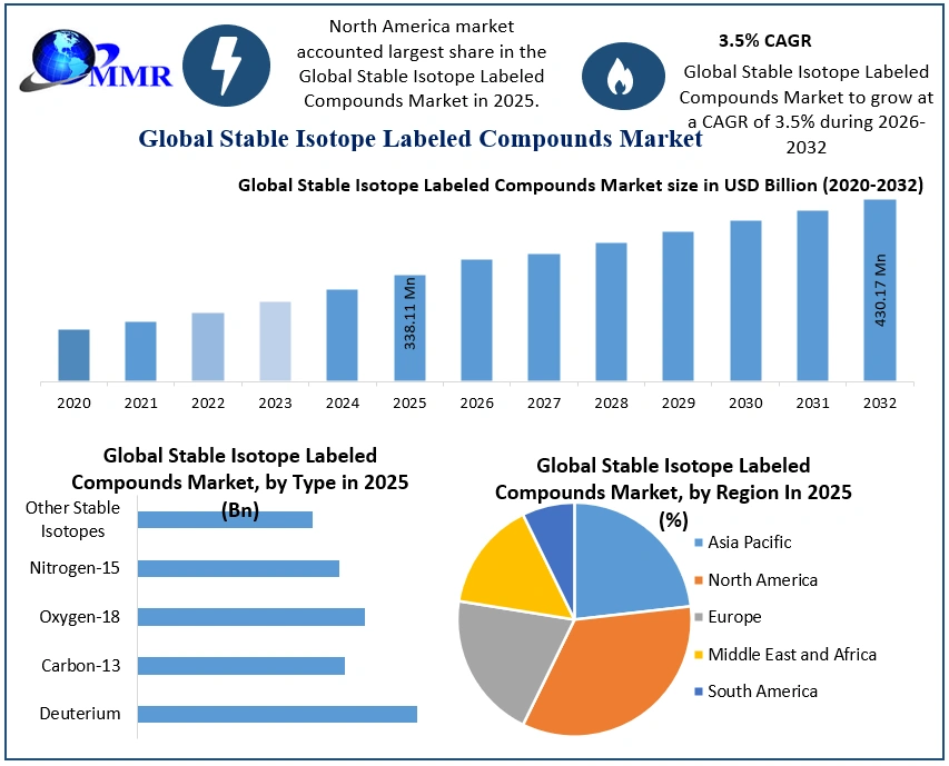 Global Stable Isotope Labeled Compounds Market Report Coverage Details Base Year: 2025 Forecast Period: 2026-2032 Historical Data: 2020 to 2025 Market Size in 2025: USD 338.11 Mn. Forecast Period 2026 to 2032 CAGR: 3.5% Market Size in 2032: USD 430.17 Mn. Segments Covered: By Type Deuterium Carbon-13 Oxygen-18 Nitrogen-15 Other Stable Isotopes By Application Research Biomedical Research Pharmaceutical Research Environmental & Ecological Research Agricultural Research Clinical Diagnostics Industrial Other Applications By End-User Pharmaceutical and Biotechnology Companies Academic & Research Institutes Hospitals and Diagnostic Centers Stable Isotope Labeled Compounds Market, by Region: