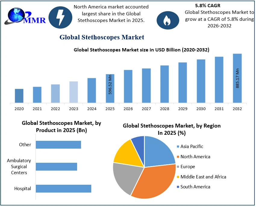 Stethoscopes Market Report Coverage Details Base Year: 2025 Forecast Period: 2026-2032 Historical Data: 2020 to 2025 Market Size in 2025: USD 596.52 Mn. Forecast Period 2026 to 2032 CAGR: 5.8% Market Size in 2032: USD 885.17 Mn. Segments Covered: by Product Hospital Ambulatory Surgical Centers Other by Technology Manual Stethoscope Electronic Stethoscope Stethoscopes Market, by Region