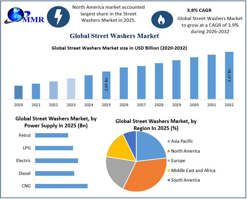 Global Street Washers Market Report Coverage Details Base Year: 2025 Forecast Period: 2026-2032 Historical Data: 2020 to 2025 Market Size in 2025: USD 2.65 Bn. Forecast Period 2026 to 2032 CAGR: 3.9% Market Size in 2032: USD 3.47 Bn. Segments Covered: by Washing Type High-pressure street washing machine Low pressure street washing machine by Application Municipal Airport Ports Industrial Highway Large-Scale Retail Channels Others by Power Supply CNG Diesel Electric LPG Petrol Street Washers Market, by Region