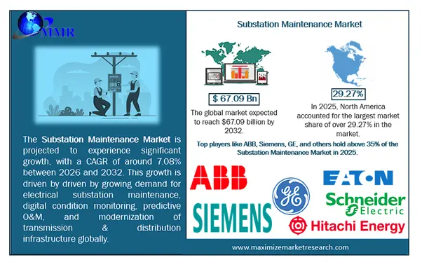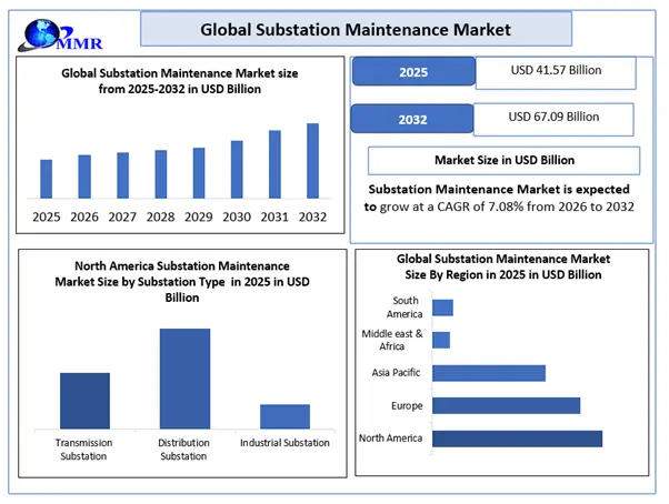 Global Substation Maintenance Market Report Coverage Details Base Year: 2025 Forecast Period: 2026-2032 Historical Data: 2020 to 2025 Market Size in 2025: USD 41.57 Bn. Forecast Period 2026 to 2032 CAGR: 7.08% Market Size in 2032: USD 67.09 Bn. Segments Covered: by Substation Type Transmission Substation Distribution Substation Industrial Substation by Service Type Preventive Maintenance Predictive Maintenance Corrective Maintenance Remote Monitoring by Component Transformers Switchgear Relay & Protection Systems Busbars Capacitors & Reactors SCADA Systems by Voltage Level Up to 220 kV 220 – 500 kV Above 500 kV by Industry Utility Heavy Industries Transportation Substation Maintenance Market by Region