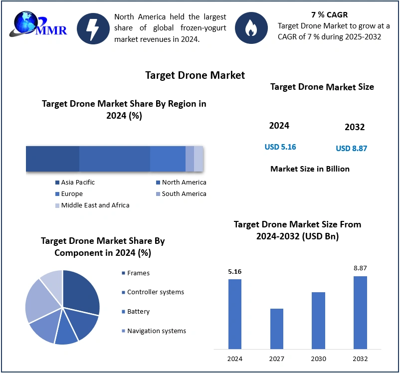 Global Target Drone Market Report Coverage Details Base Year: 2024 Forecast Period: 2025-2032 Historical Data: 2019 to 2024 Market Size in 2024: USD 5.16 Bn. Forecast Period 2025 to 2032 CAGR: 7% Market Size in 2032: USD 8.87 Bn. Segments Covered: by Type Fixed wing Rotary wing Hybrid by Engine Type Internal Combustion Jet Electric Others by Target Type Full Scale Sub-Scaled Towing Others by Payload Capacity Low (<20 kg) Medium (20–40 kg) High (>40 kg) by Mode of Operation Remotely Operated Optionally Piloted Autonomous Operation by Platform Aerial Drones Marine Drones Ground Drones by Component Frames Controller systems Battery Navigation systems Electrical Systems & Wire Harnesses Others by Application Training & Simulation Weapon Testing & Evaluation Electronic Warfare Training Others by End User Defense Commercial Target Drone Market by Region
