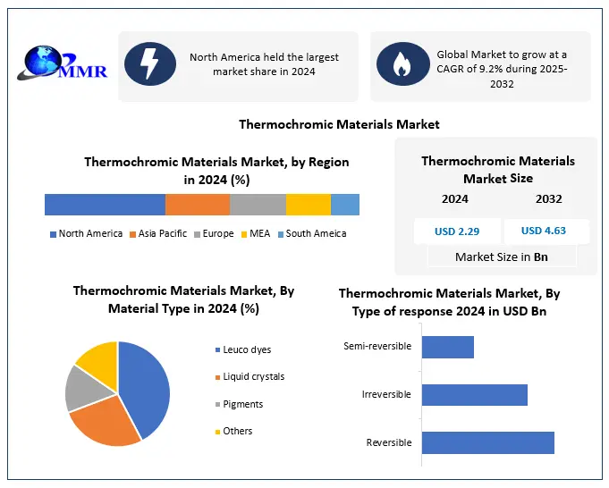 Thermochromic Materials Market was valued at USD 2.29 Bn in 2024, and the total Thermochromic Materials Market revenue is expected to grow at a CAGR of 9.2% and reach nearly USD 4.63 Bn from 2025 to 2032. Thermochromic materials, prevalent in the Thermochromic Materials Market, possess a captivating quality they change color in response to temperature shifts. This incredible ability stems from two primary types: liquid crystals and leuco dyes. Liquid crystals rearrange their molecular structure with temperature changes, altering light interactions and resulting in color shifts. Leuco dyes, on the other hand, modify their chemical composition at varying temperatures, affecting their light absorption and perceived color. Their applications are diverse and practical. From temperature indicators in thermometers and smart clothing to security features in documents and packaging, these materials offer versatility. They also serve decorative purposes in items like mugs and clothing, and even find use in solar control, regulating heat and light transmittance in smart windows.To know about the Research Methodology:-Request Free Sample Report Ongoing research explores more advanced functionalities, hinting at a promising future for the Thermochromic Materials Market. This includes biocompatible materials for medical monitoring, energy harvesting from temperature fluctuations, and adaptive camouflage capabilities. The potential for innovative applications seems boundless, ensuring that thermochromic materials will continually dazzle us with their colorful transformations. The Thermochromic Materials market experiences robust growth propelled by a surging demand for smart packaging and textiles. These materials offer multifaceted benefits across various domains. They are highly instrumental in enhancing consumer safety and convenience, acting as indicators of food spoilage in packaging and regulating body temperature in textiles, thereby enhancing safety and comfort levels for end-users. the ability of thermochromic materials to offer customization and personalization in products is a key driver. These materials enable unique designs, satisfying consumer preferences for personalized items. Imagine a mug that displays a personalized design when hot or a t-shirt with a logo that changes color with mood these possibilities drive consumer interest and market growth. Sustainability is another critical aspect bolstering the market. Thermochromic materials are utilized in smart windows to save energy by regulating temperature and are being developed with biodegradable properties, contributing to eco-friendly production practices. This eco-conscious approach aligns with the growing emphasis on sustainability across various industries. Advancements in technology have significantly boosted the appeal of thermochromic materials. Newer materials exhibit improved features like faster response times, wider color ranges, and increased durability, making them more attractive for a wide array of applications. Increasing disposable incomes, particularly in the Asia-Pacific region, fuel the demand for smart products, driving market growth. The convergence of these factors, aligning with consumer preferences for convenience, personalization, and sustainability, is expected to sustain the Thermochromic Materials market's growth trajectory as technology evolves and demand intensifies for innovative solutions.