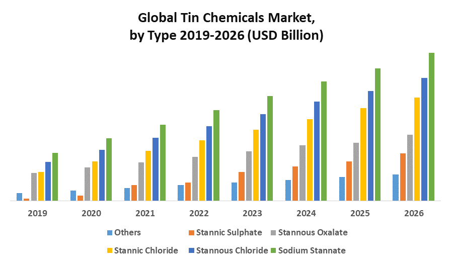 Rising usage of tin plating in various industries along with technological advancements in the chemical sector is expected to drive the tin chemicals market demand. Several product types of tin chemicals are utilized in chemical sectors as an intermediate. Rising chemical industries in developing countries are expected to boost chemicals demand. For example, BASF a key chemical producer registered a growth of 4.2% in chemical production during the forecast period in the emerging markets of Asia Pacific. The growth of alternatives to tin chemicals have considerably increased the threat of price-based substitutions. For example, calcium-zinc products are used as PVC stabilizers because they are cheaper than tin stabilizers. Iron sulphate is used as an alternative for stannous sulphate or stannous chloride in cement additives application. Nevertheless, poorer properties of these alternatives are prevented them from penetrating deep into the market. Also, rising tin prices are considered a challenge for tin chemicals market growth. As per the London Metal Exchange, tin prices are increased by 55% since June 2015, reaching US$ 21750 per ton in Feb 2019. Thus, growth in prices and the development of new substitutes for tin chemicals is expected to restrain the tin chemicals market growth during the forecast period.Tin Chemicals Market Segment Analysis: