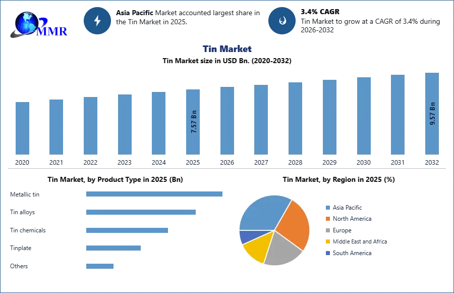 The Tin Market size was valued at USD 7.57 billion 2025 and the total Tin revenue is expected to grow at a CAGR of 3.4% from 2026 to 2032, reaching nearly USD 9.57 billion in 2032