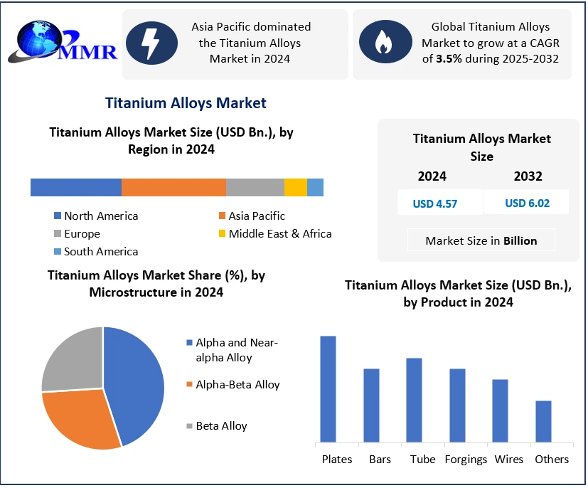 Global Titanium Alloys Market Report Coverage Details Base Year: 2024 Forecast Period: 2025-2032 Historical Data: 2019 to 2024 Market Size in 2024: USD 4.57 Bn. Forecast Period 2025 to 2032 CAGR: 3.5% Market Size in 2032: USD 6.02 Bn. Segments Covered: by Micristructure Alpha and Near-alpha Alloy Alpha-Beta Alloy Beta Alloy by Product Plates Bars Tube Forgings Wires Others by Grade Commercially Pure Titanium (Grades 1-4) Titanium Alloy Grades (Grade 5, Grade 23) by End-Use Industry Aerospace Automotive Shipbuilding Chemical Power & Desalination Oil & Gas Industrial Manufacturing Others Titanium Alloys Market, by Region