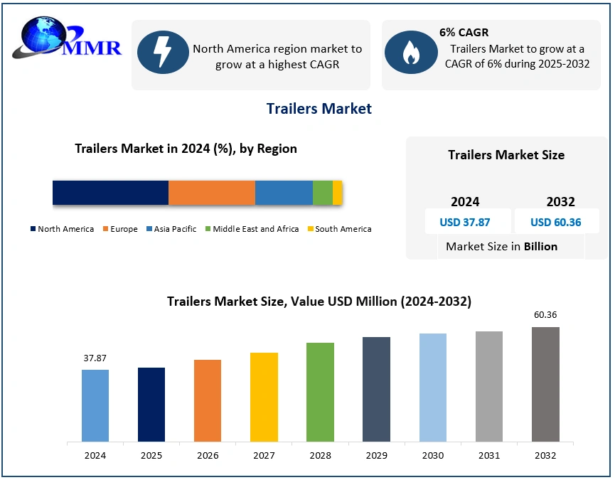 Trailers Market Report Coverage Details Base Year: 2024 Forecast Period: 2025-2032 Historical Data: 2019 to 2024 Market Size in 2024: USD 37.87 Bn. Forecast Period 2025 to 2032 CAGR: 6% Market Size in 2032: USD 60.36 Bn. Segments Covered: by Type Enclosed Trailers Dump Trailers Tank Trailers Flatbed Trailers Other Trailers by End-Use Logistics Paper And Paper Types Pharma Drugs Textile Types Food and groceries Agriculture And Farm Types Petroleum And Petroleum Types Motor Vehicle And Motor Vehicle Parts Metal And Minerals Commercial Machinery Other Types Trailers Market, by Region