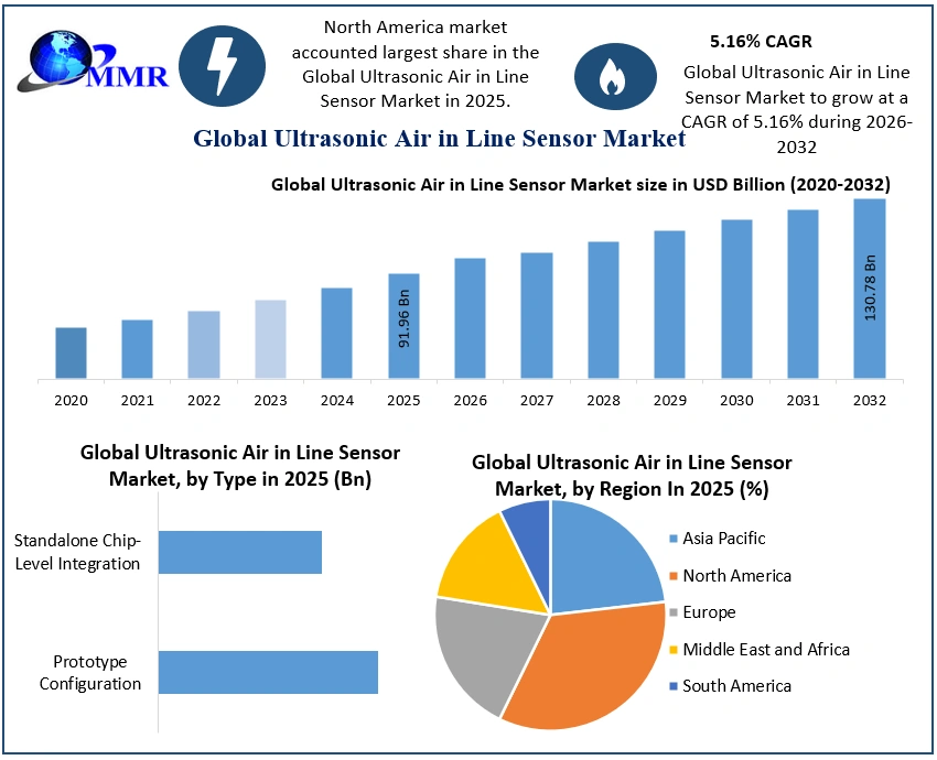 Global Ultrasonic Air in Line Sensor Market Report Coverage Details Base Year: 2025 Forecast Period: 2026-2032 Historical Data: 2020 to 2025 Market Size in 2025: USD 91.96 Bn. Forecast Period 2026 to 2032 CAGR: 5.16% Market Size in 2032: USD 130.78 Bn. Segments Covered: by Type Prototype Configuration Standalone Chip-Level Integration by Application Dialysis & Transfusions Heart-Lung Machines Blood separators Pumps For Medical Technology Diagnostic Systems & Other Devices by End User Hospitals & Home Care Settings Academic & Research Institutes Ultrasonic Air in Line Sensor Market, by Region