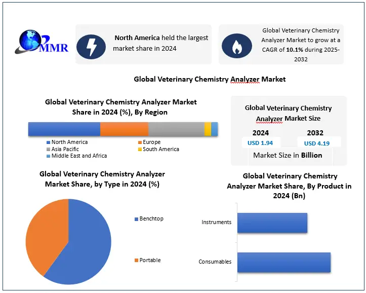 Global Veterinary Chemistry Analyzer Market size was valued at USD 1.94 Bn. in 2024, and the total Global Veterinary Chemistry Analyzer Market revenue is expected to grow by 10.1% from 2025 to 2032, reaching nearly USD 4.19 Bn. The report includes the analysis of impact of COVID-19 lock-down on the revenue of market leaders, followers, and disrupters. Since lock down was implemented differently in different regions and countries, impact of same is also different by regions and segments. The report has covered the current short term and long term impact on the market, same will help decision makers to prepare the outline for short term and long term strategies for companies by region.To Know About The Research Methodology :- Request Free Sample Report In terms of type Global market is classified into Benchtop and portable. Instruments, Consumables are the product segment of the global market. Companion Animals and Livestock are the animals of the global veterinary chemistry analyzer market. Blood Chemistry Analysis, Urinalysis, Blood Gas & Electrolyte Analysis and Glucose Monitoring are the application of the global veterinary chemistry analyzer market. Geographically Global Veterinary Chemistry Analyzer Market is segregated into North America, Latin America, Asia-Pacific, Europe and Middle East & Africa.