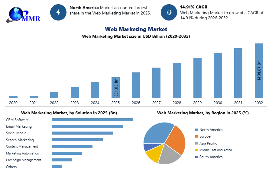 The Global Web Marketing market size reached USD 531.05 Bn in 2025 and is expected to reach USD 1404.88 Bn by 2032, growing at a CAGR of 14.91 % during the forecast period.