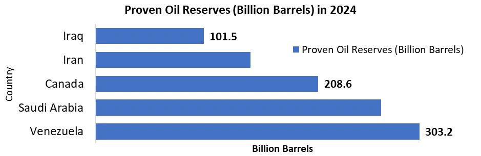 North America held the largest market share around 37% in 2025, driven by: • Extensive shale oil and gas developments. • High offshore activity in the Gulf of Mexico. • Investments in digital and automated wellhead systems. • Ongoing modernisation of aging assets in the region. Asia-Pacific is the Fastest-Growing Region in the Wellhead Equipment Market: • Expanding oil & gas exploration, offshore drilling, and increasing energy consumption. • Significant investments in subsea wellhead systems and wellhead automation. • Modernization of oilfield infrastructure in China, India, and Australia. • Strong regional demand for advanced wellhead technologies, driving the adoption of automation and subsea systems. Proven Oil Reserves in Major Country in 2024In the Middle East & Africa, countries like Saudi Arabia, UAE, Nigeria, and Angola are heavily investing in advanced wellhead technologies. These investments are aimed at supporting offshore exploration and the deployment of high-pressure wellhead systems, which are crucial for increasing production and improving reliability in challenging offshore environments.