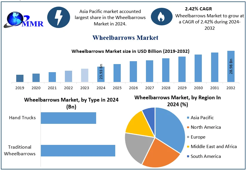 Global Wheelbarrows Market Report Coverage Details Base Year: 2024 Forecast Period: 2025-2032 Historical Data: 2019 to 2024 Market Size in 2024: USD 23.93 Bn. Forecast Period 2025 to 2032 CAGR: 2.42% Market Size in 2032: USD 28.98 Bn. Segments Covered: by Type Traditional Wheelbarrows Hand Trucks by Application Construction Applications Industrial Applications Home Applications Agriculture & Livestock Wheelbarrows Market, by Region