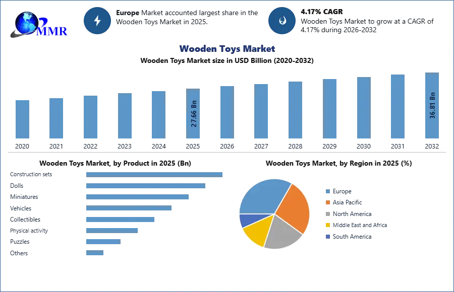 Global Wooden Toys Market size was valued at USD 27.66 Bn. in 2025 and the total wooden toys revenue is expected to grow by 4.17% from 2026 to 2032, reaching nearly USD 36.81 Bn