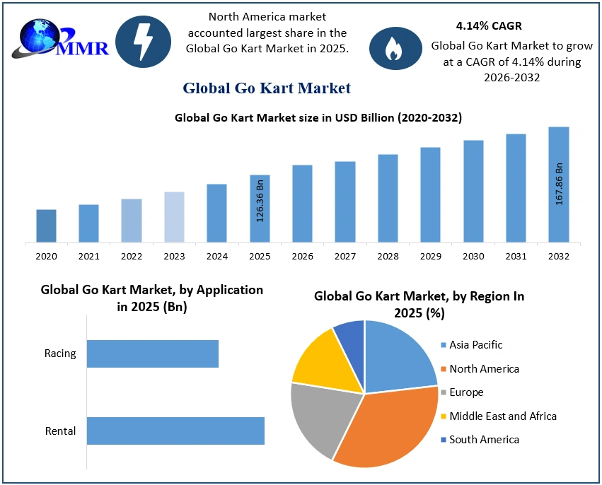 Go Kart Market Report Coverage Details Base Year: 2025 Forecast Period: 2026-2032 Historical Data: 2020 to 2025 Market Size in 2025: USD 126.36 Bn. Forecast Period 2026 to 2032 CAGR: 4.14% Market Size in 2032: USD 167.86 Bn. Segments Covered: by Type Electric Gasoline Other by Product Outdoor Karting Indoor Karting by Application Rental Racing by Seating Capacity Single Double Seater Go Kart Market, by Region