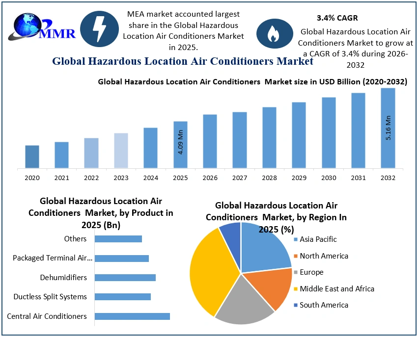 Hazardous Location Air Conditioners Market Report Coverage Details Base Year: 2025 Forecast Period: 2026-2032 Historical Data: 2020 to 2025 Market Size in 2025: USD 4.09 Mn. Forecast Period 2026 to 2032 CAGR: 3.4% Market Size in 2032: USD 5.16 Mn. Segments Covered: by Product Central Air Conditioners Ductless Split Systems Dehumidifiers Packaged Terminal Air Conditioners (PTAC) Others by End-User Chemical Oil and Gas Mining Food and Beverage Marine Others Hazardous Location Air Conditioners Market, by Region
