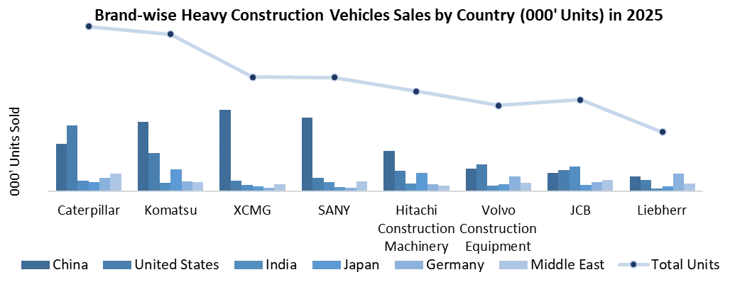 Between 2020 and 2024, the penetration rate of heavy construction vehicles increased steadily in emerging economies due to infrastructure expansion and contractor fleet formalisation. Adoption of rental and leasing models increased sharply, especially among mid-sized contractors. Rental penetration rose from 32% in 2020 to nearly 44% in 2025, improving equipment utilisation and lowering capex barriers. Global infrastructure spending is a key driver propelling the heavy construction vehicles market. For instance, the U.S. government allocated over USD 350 billion in 2024 to enhance highways, transportation, and energy infrastructure, directly stimulating demand for advanced construction equipment. Similarly, the UK and other developed economies are channelling substantial investments toward energy and transportation projects, highlighting a clear governmental push that fosters market growth.The graph displays the brand-wise heavy construction vehicles sales by country in 2025 (measured in thousands of units). It highlights the sales distribution of leading brands like Caterpillar, Komatsu, XCMG, and others across various regions, with China showing the highest sales volume.