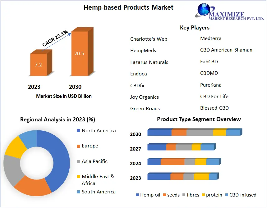Global Hemp-based Products Market Report Coverage Details Base Year: 2023 Forecast Period: 2024-2030 Historical Data: 2018 to 2023 Market Size in 2023: US $ 7.2 Bn. Forecast Period 2024 to 2030 CAGR: 22.1% Market Size in 2030: US $ 20.5 Bn. Segments Covered: by Product Type Hemp oil Seeds Fibres Protein CBD-infused by Application Food and drinks Textiles Personal care Pharmaceuticals Others by Source Organic Conventional Hemp-based Products Market, by Region