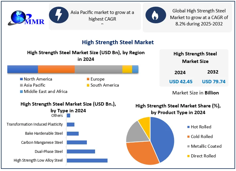 Global High Strength Steel Market Report Coverage Details Base Year: 2024 Forecast Period: 2025-2032 Historical Data: 2019 to 2024 Market Size in 2024: USD 42.45 Bn. Forecast Period 2025 to 2032 CAGR: 8.2% Market Size in 2032: USD 79.74 Bn. Segments Covered: by Type High Strength Low Alloy Steel Dual-Phase Steel Carbon Manganese Steel Bake Hardenable Steel Transformation Induced Plasticity Others by Product Type Hot Rolled Cold Rolled Metallic Coated Direct Rolled by Application Body And Closure Suspensions Bumper and Intrusion Beans Others by End User Industry Automotive Construction Yellow Goods and Mining Equipment Aviation and Marine Others High Strength Steel Market, by Region