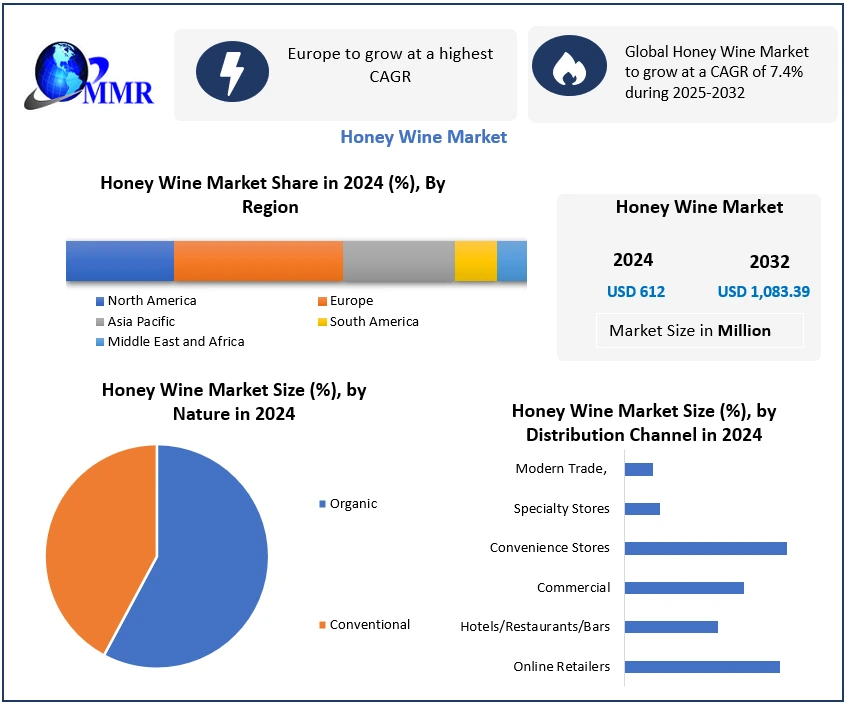 Global Honey Wine Market Report Coverage Details Base Year: 2024 Forecast Period: 2025-2032 Historical Data: 2019 to 2024 Market Size in 2024: USD 612 Mn. Forecast Period 2025 to 2032 CAGR: 7.4% Market Size in 2032: USD 1083.39 Mn. Segments Covered: by Product Type Carbonated Dry Semi-Dry Sweet Semi-Sweet by Nature Organic Conventional by Variety Traditional and Cyser Melomel Pyment Metheglin by Application On-premise (Bars, Restaurants, Tasting Rooms) Off-premise (Retail Stores, Online Platforms) by Distribution Channel Modern Trade, Specialty Stores Convenience Stores Commercial Hotels/Restaurants/Bars Online Retailers Honey Wine Market by Region: