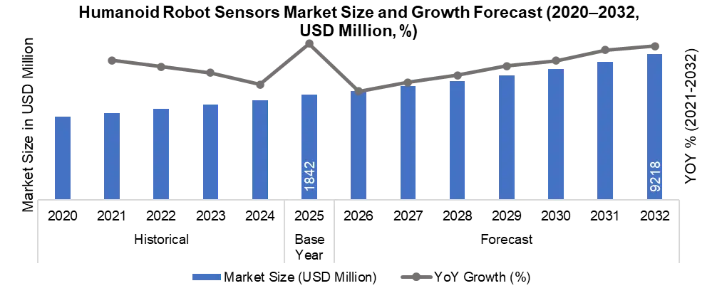 The Global Humanoid Robot Sensors Market was valued USD 1,842 Million in 2025 and is projected to reach around USD 9,218 Million by 2032, growing at a CAGR of 25.8% during 2026–2032.