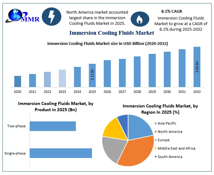 Immersion Cooling Fluids Market Report Coverage Details Base Year: 2025 Forecast Period: 2026-2032 Historical Data: 2020 to 2025 Market Size in 2025: USD 2.11 Bn. Forecast Period 2026 to 2032 CAGR: 8.1% Market Size in 2032: USD 3.65 Bn. Segments Covered: by Cooling Fluid Mineral Oil Synthetic Fluids Fluorocarbon-based Fluids Others by Product Single-phase Two-phase by Application High-performance Computing Edge Computing Cryptocurrency Mining Artificial Intelligence Others Immersion Cooling Fluids Market,by Region