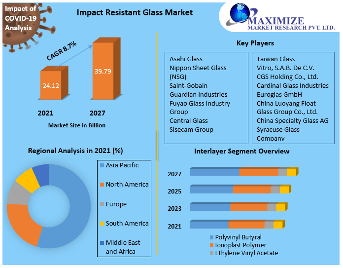 Impact Resistant Glass Market is expected to reach US$ 5.19 Bn. by 2029. Laminated glass that is impact-resistant (IR) can be utilised to add extra defence against flying debris and disruptive noise. This report focuses on the different segments of the Impact Resistant Glass market (Interlayer, End-Use Industry, and Region). The leading industry players and regions are thoroughly examined in this report (North America, Asia Pacific, Europe, Middle East & Africa, and South America). It's a thorough examination of today's quick advances in a variety of sectors. The primary data analysis from 2022 to 2029 is demonstrated through facts and figures, visualisations, and presentations. The market drivers, restraints, opportunities, and challenges for Impact Resistant Glass are examined in this report. The MMR report's investment suggestions are based on a thorough examination of the current competitive environment in the Impact Resistant Glass market.To know about the Research Methodology :- Request Free Sample Report