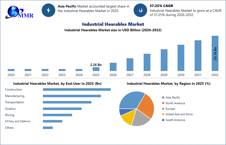 Global Industrial Hearables Market was US$2.26 billion in 2025 and is expected to grow at a CAGR of 37.25% to an estimated revenue of US$ 20.74 Billion by 2032.