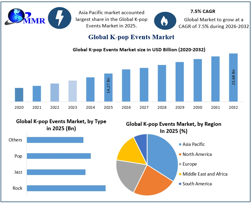 Global K-pop Event Market Report Coverage Details Base Year: 2025 Forecast Period: 2026-2032 Historical Data: 2020 to 2025 Market Size in 2025: USD 14.27 Bn. Forecast Period 2026 to 2032 CAGR: 7.5% Market Size in 2032: USD 23.68 Bn. Segments Covered: By Type Rock Jazz Pop Others By Revenue Source Tickets Online Offline Sponserships Others By Gender Male Female Global K-pop Event Market, by Region