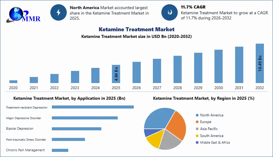 The Ketamine Treatment Market was valued at USD 4.84 Bn in 2025, and total global Ketamine Treatment Market revenue is expected to grow at a CAGR of 11.7% & reaching nearly USD 10.49 Bn from 2025-2032