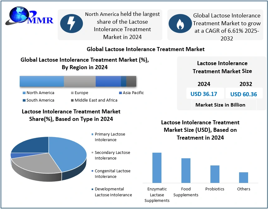 The Global Lactose Intolerance Treatment Market size was valued at USD 36.17 Bn. in 2024, and the total Global Lactose Intolerance Treatment Market revenue is expected to grow by 6.61% from 2024 to 2032, reaching nearly USD 60.36 Bn.Global Lactose Intolerance Treatment Market Overview