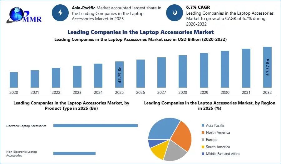 Global Laptop Accessories Market size was valued at USD 42.79 Billion in 2025 and the total Laptop Accessories revenue is expected to grow at a CAGR of 6.7% from 2025 to 2032, reaching nearly USD 67.37 Billion.